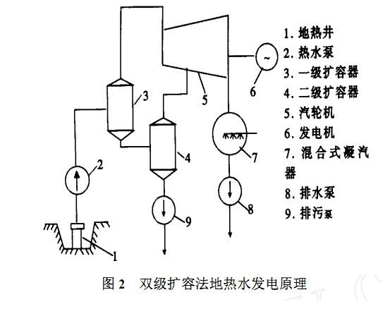 西南電力設(shè)計(jì)院設(shè)計(jì)的羊八井地?zé)?/a>電站第1臺(tái)試驗(yàn)機(jī)組,容量為1000kW,汽輪機(jī)是利用四川內(nèi)江電廠2500kW廢棄設(shè)備改造而成。于1977年10月試運(yùn)成功,采用單級(jí)擴(kuò)容法熱力系統(tǒng)。若把地?zé)崴?/a>送入1個(gè)密閉的容器中降壓、擴(kuò)容,根據(jù)水沸點(diǎn)與壓力的關(guān)系,可使溫度不太高的地?zé)?/a>水因氣壓降低而沸騰變成蒸汽。由于地?zé)?/a>水降壓蒸發(fā)的速度很快,是一種閃急蒸發(fā)過(guò)程;同時(shí),地?zé)崴?/a>蒸發(fā)產(chǎn)生蒸汽時(shí),其體積迅速擴(kuò)大,所以該容器稱(chēng)為“擴(kuò)容器”或“閃蒸器”。用這種方法產(chǎn)生蒸汽來(lái)發(fā)電稱(chēng)為擴(kuò)容法地?zé)崴?/a>發(fā)電。這是利用地?zé)崽?/a>熱水發(fā)電的主要方式之一,該方式分單級(jí)擴(kuò)容法系統(tǒng)和雙級(jí)(或多級(jí))擴(kuò)容法系統(tǒng)。擴(kuò)容法系統(tǒng)的原理是:將地?zé)峋?/a>來(lái)的中溫地?zé)?/a>汽、水混合物,先送到擴(kuò)容器中進(jìn)行降壓、擴(kuò)容(稱(chēng)閃蒸),使其產(chǎn)生部分蒸汽,蒸汽經(jīng)過(guò)分離器除去雜質(zhì)(10μm及以上)后,再引到常規(guī)汽輪機(jī)機(jī)發(fā)電。